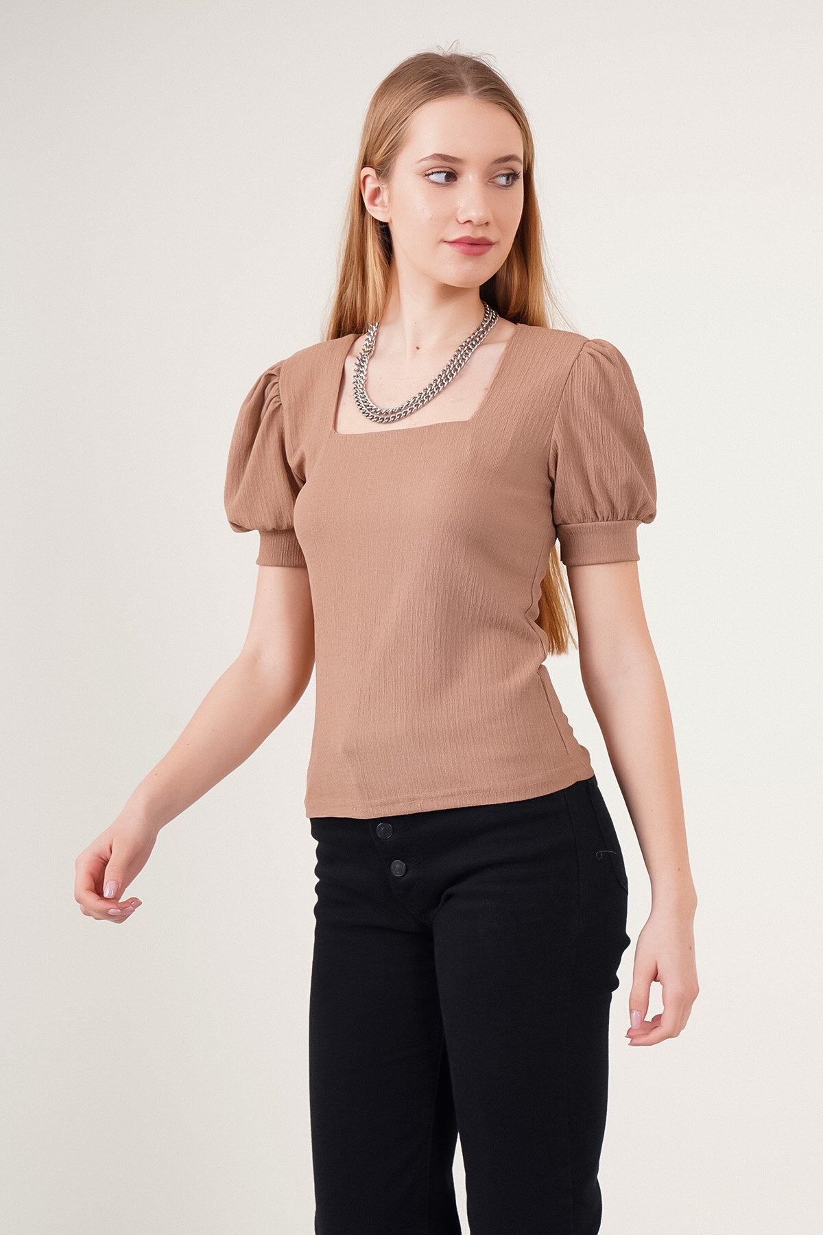 Kare Yaka Örme Bluz - B.Kahverengi 0409