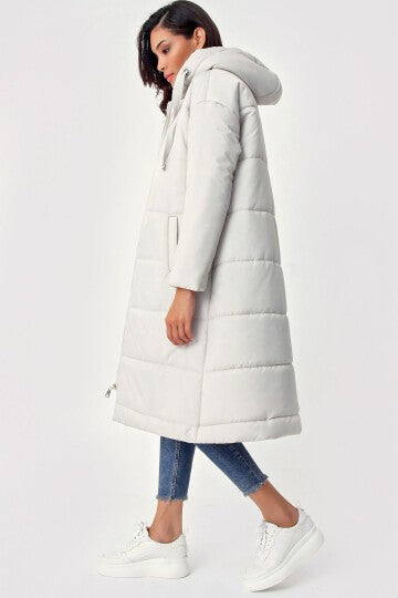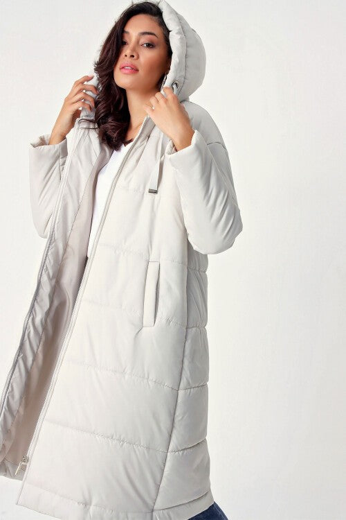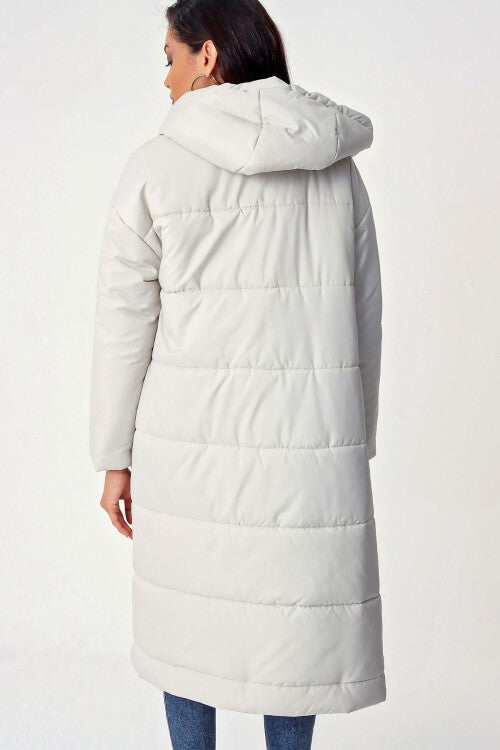 Kapşonlu Uzun Şişme Mont - Ekru 5120