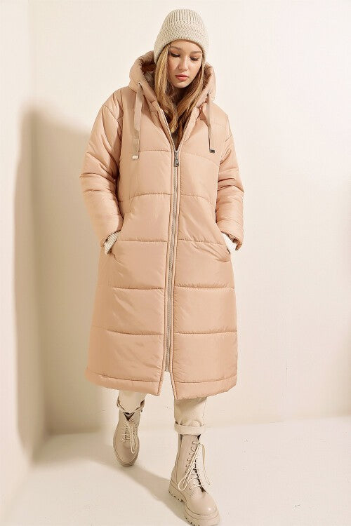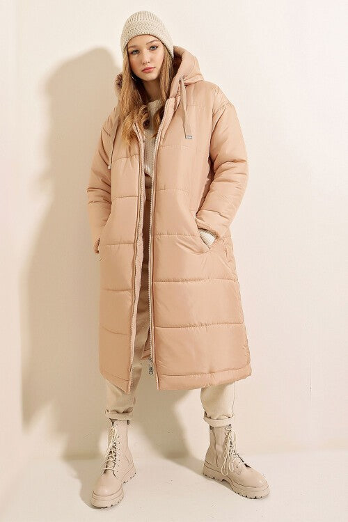 Kapşonlu Uzun Şişme Mont - Vizon 5120