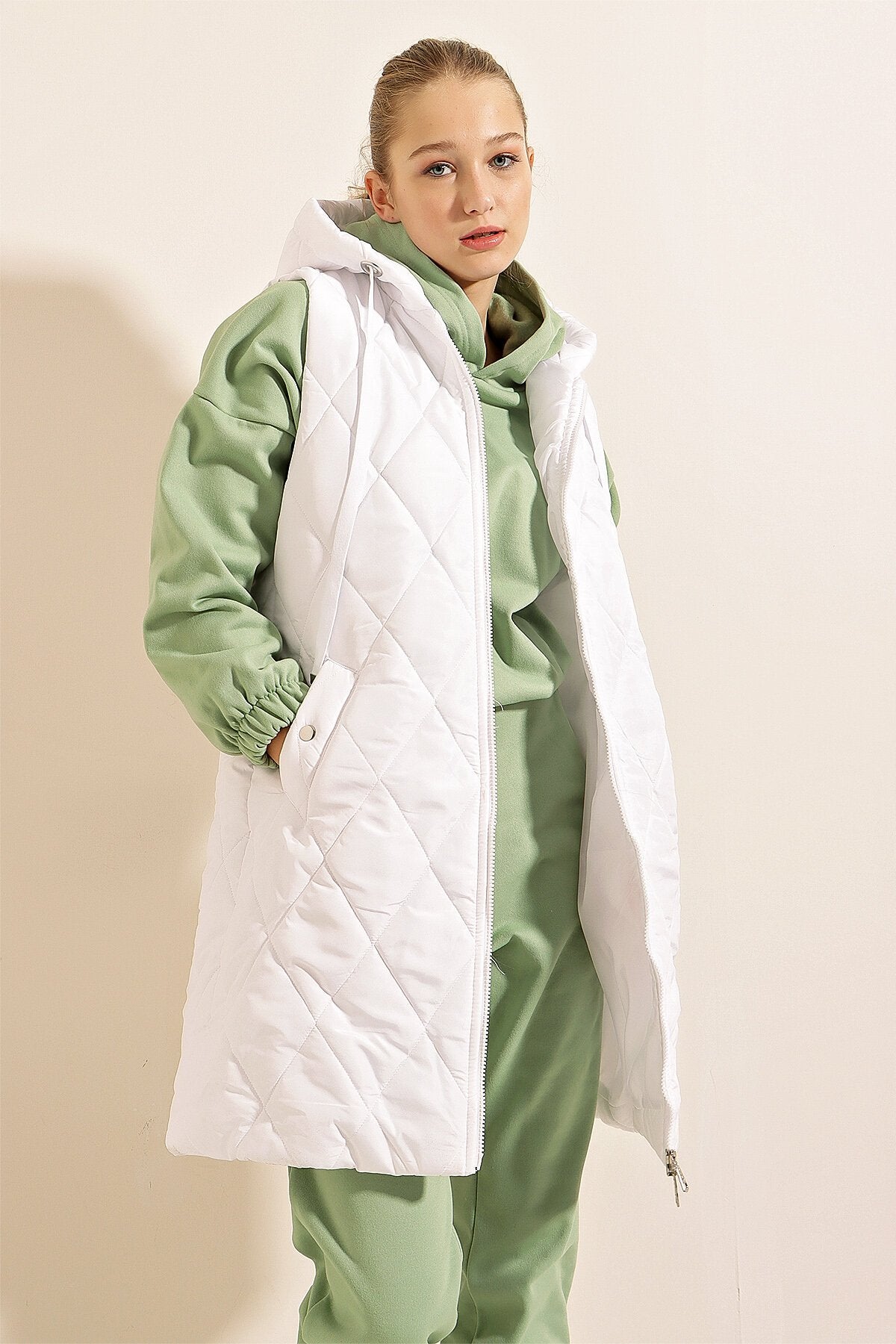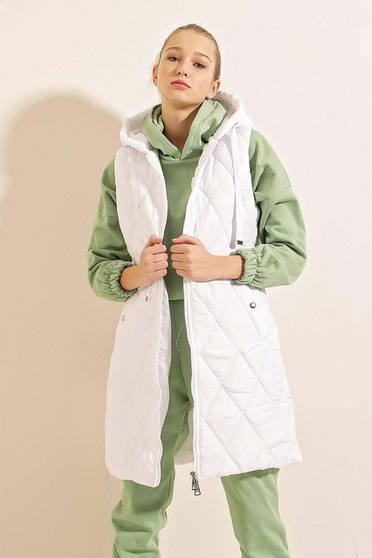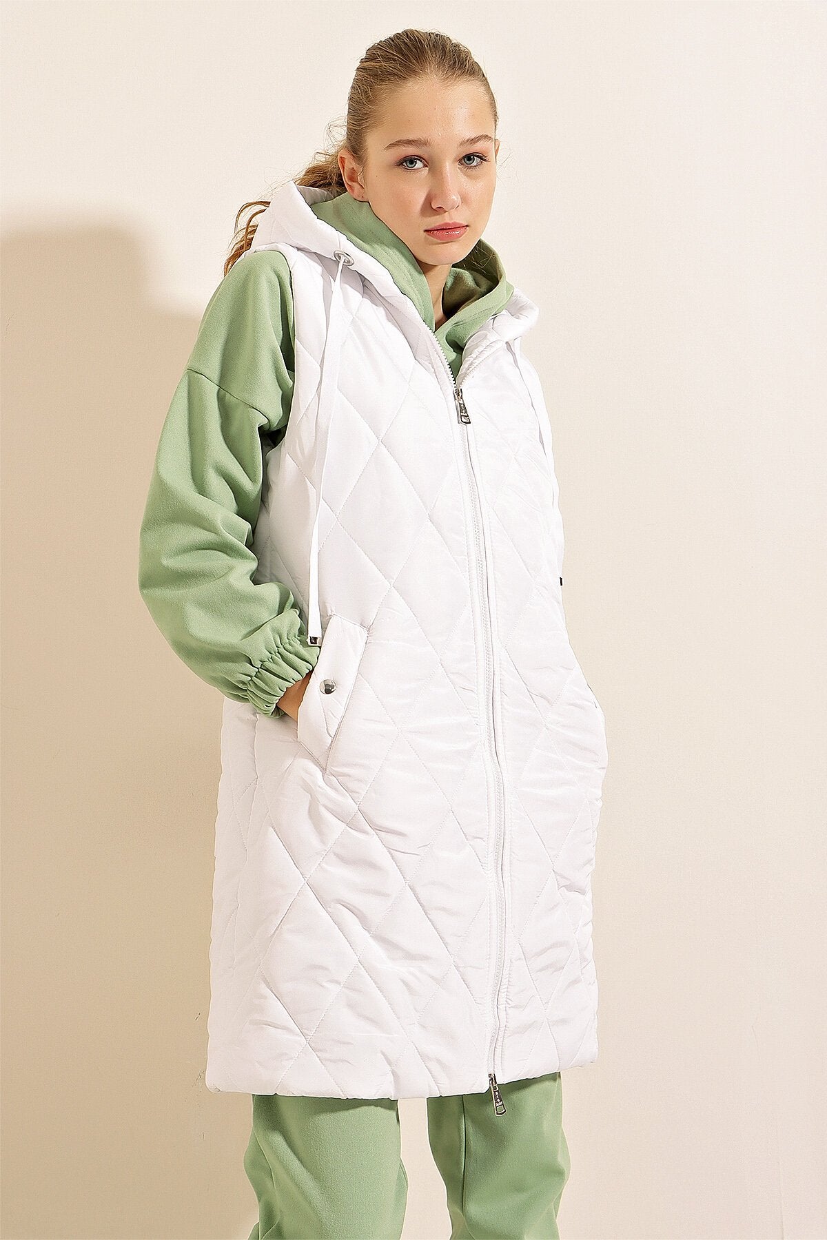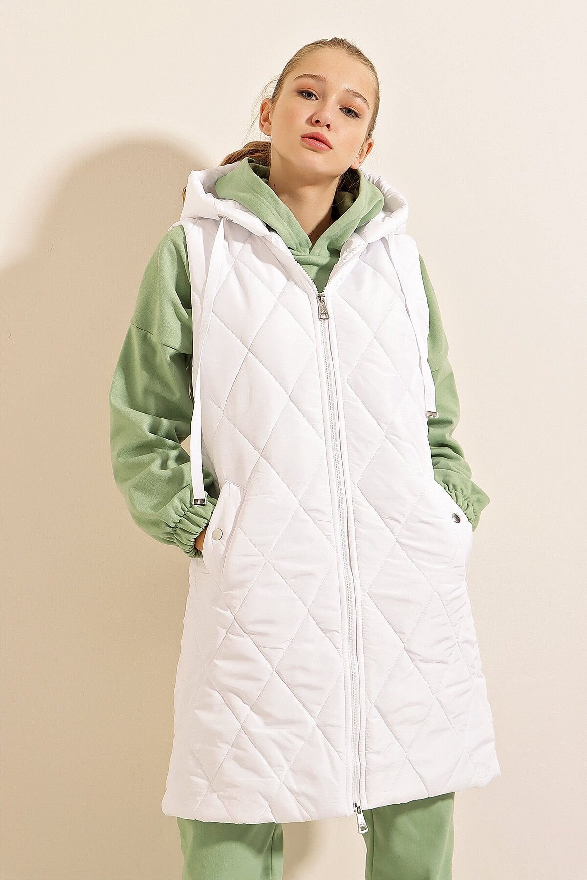Kapşonlu Uzun Şişme Yelek - Düz Beyaz 5140