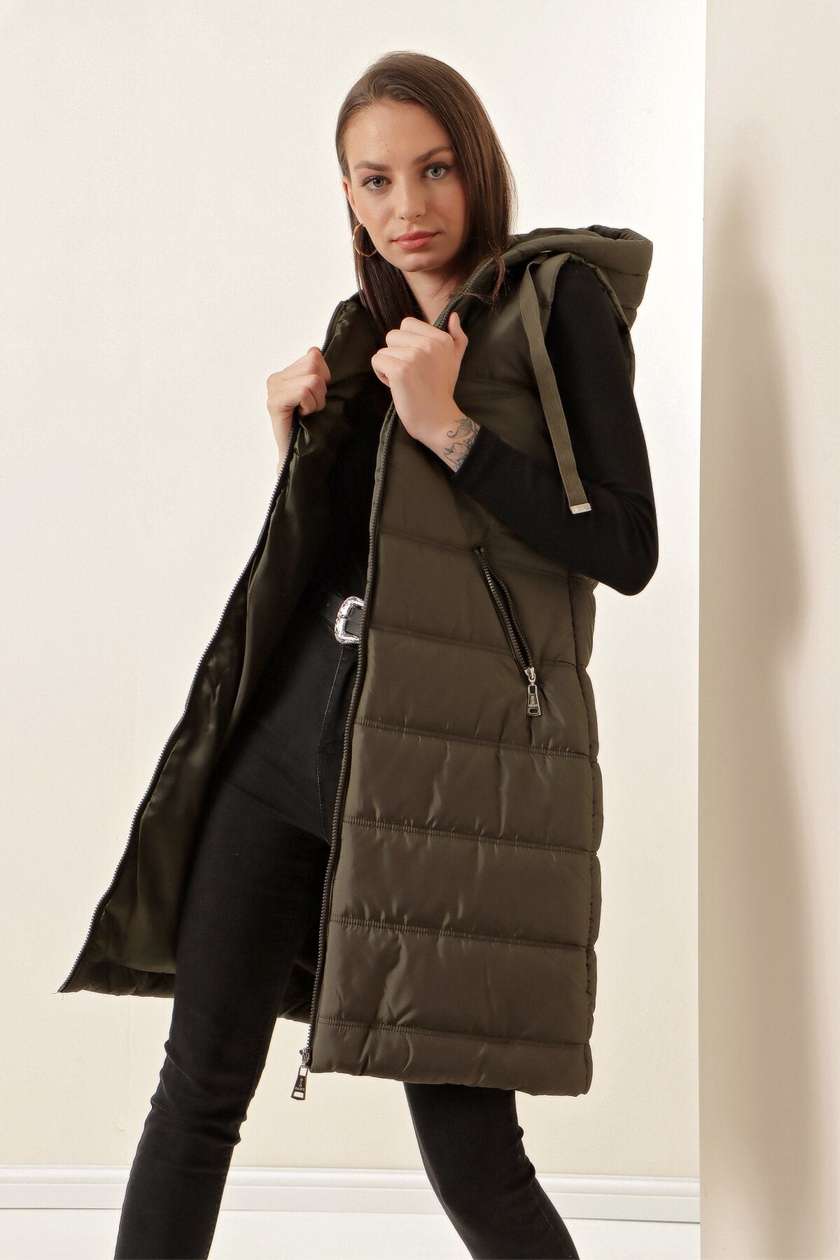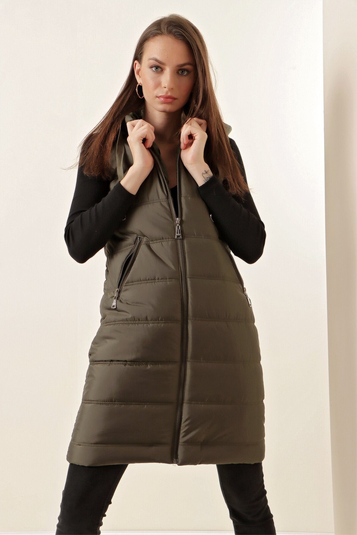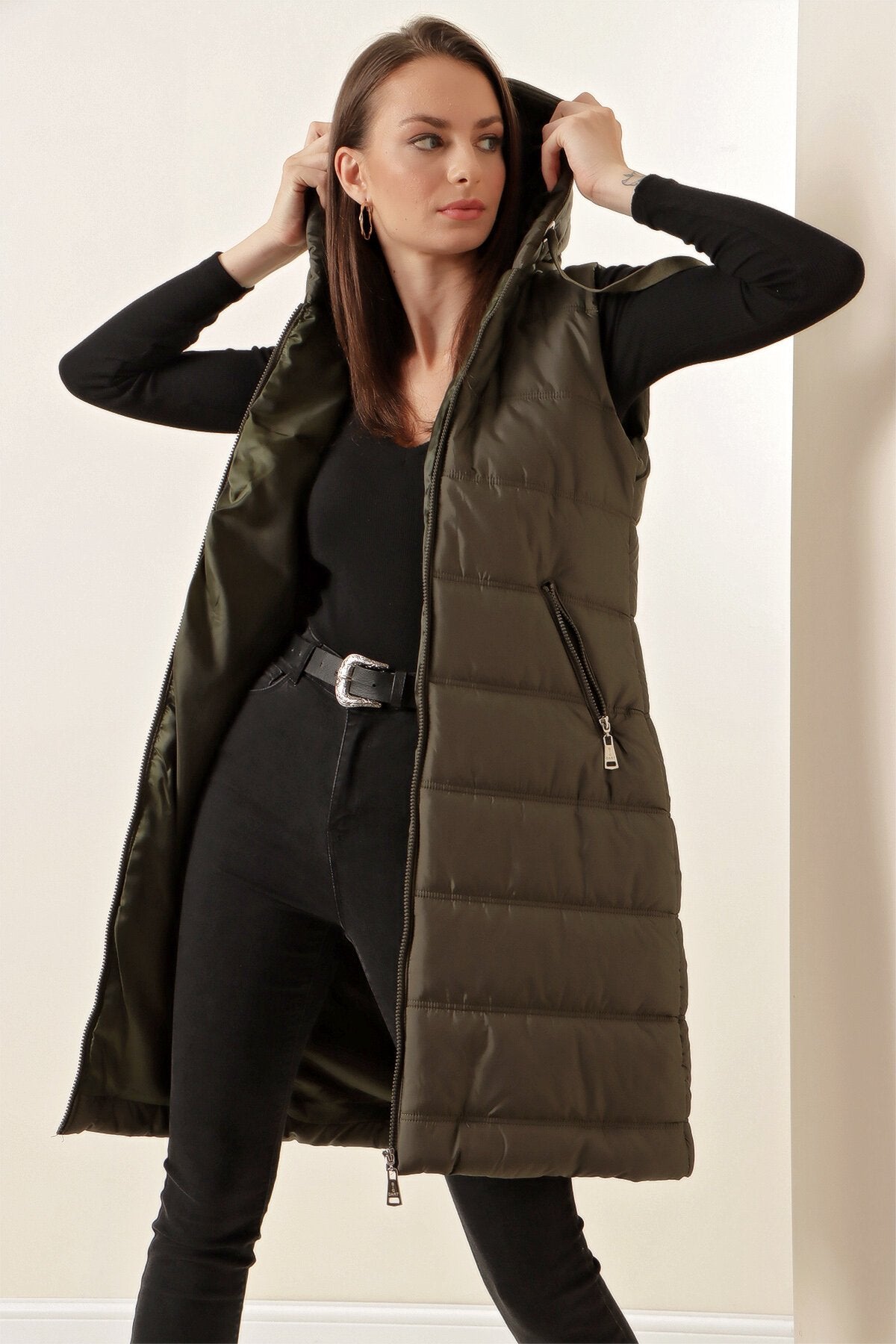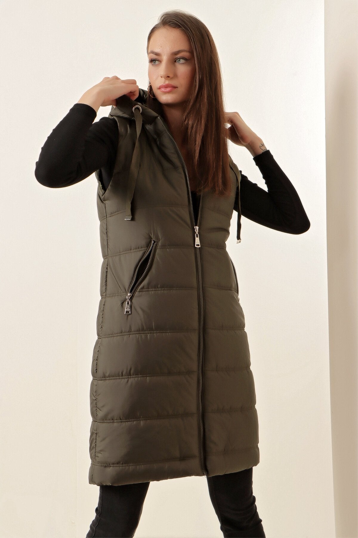 Kapşonlu Uzun Şişme Yelek - Haki 5140