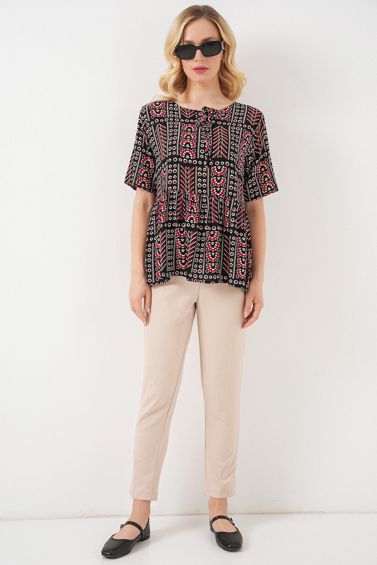 Kadın Desenli Kısa Kol Bluz 969 - Siyah