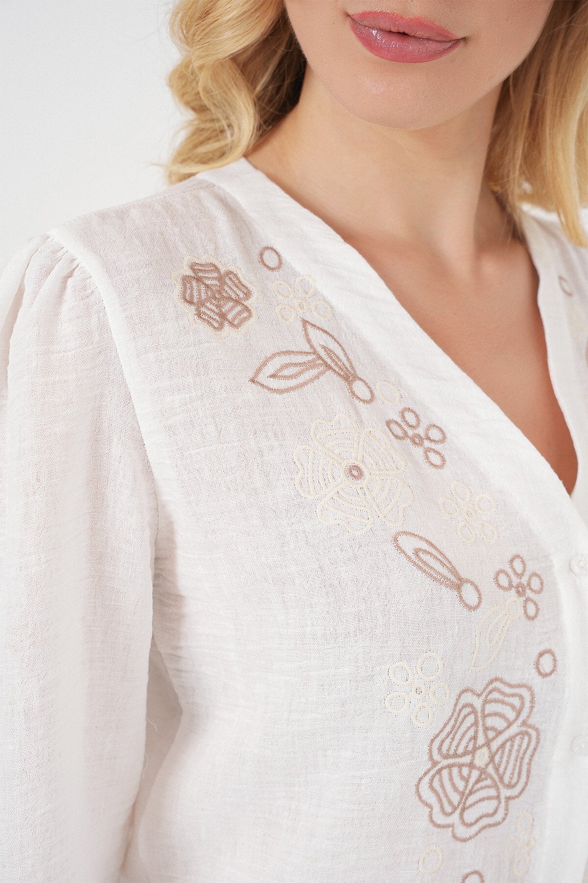 Kadın Nakışlı Uzun Kol Bluz 963 - Kahverengi