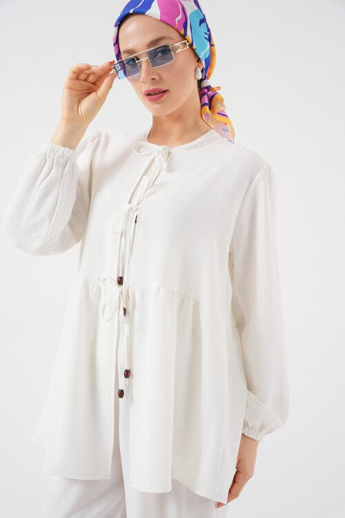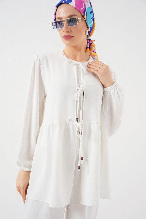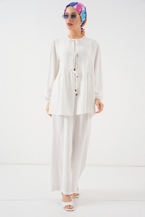 Kadın Önü Bağcıklı Tunik Pantolon İkili Takım 6744 - Beyaz
