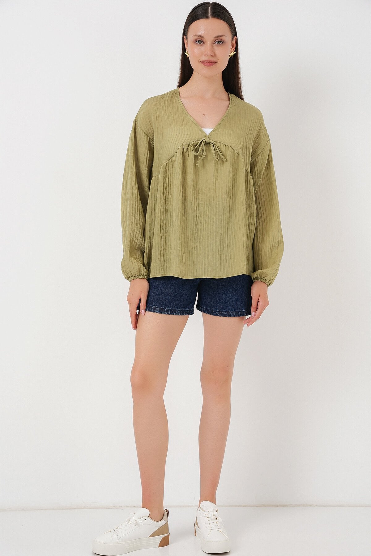 Kadın Önü Bağcıklı Uzun Kol Bluz 946 - Çağla