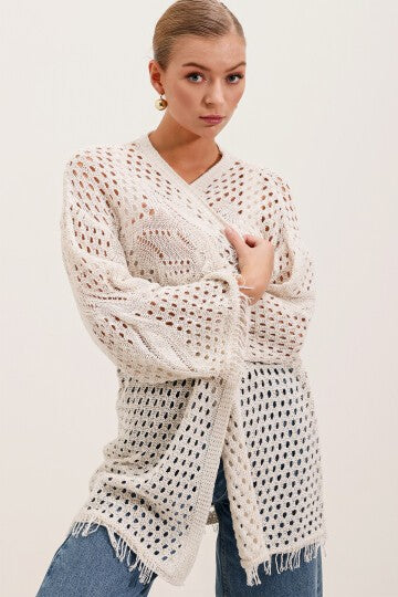 Merterium 15857 Ajurlu/Delikli Oversize Hırka - Taş