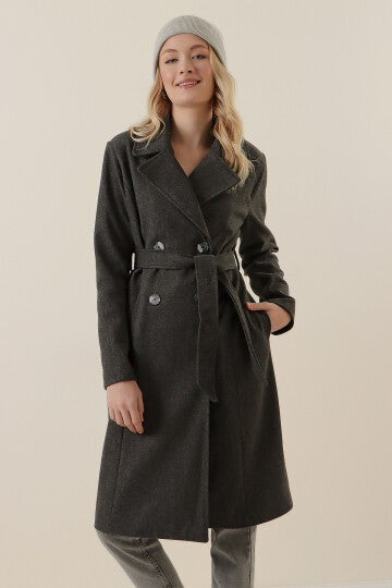 Merterium 9095 Kruvaze Yaka Kaşe Kaban - Füme