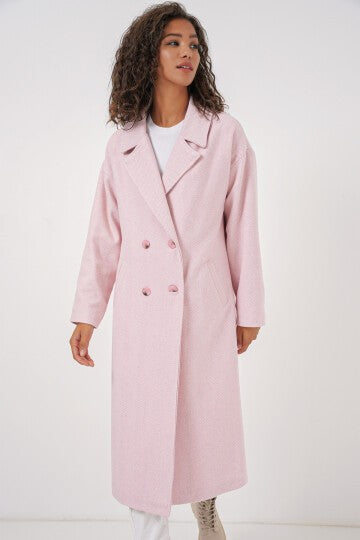 Oversize Geniş Kesim Yünlü Uzun Kaşe Kaban - Pudra 9113
