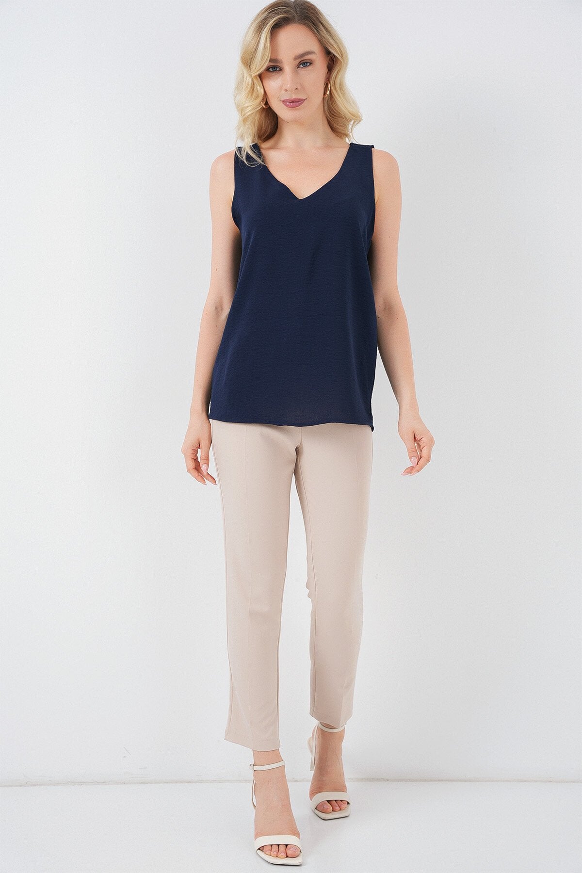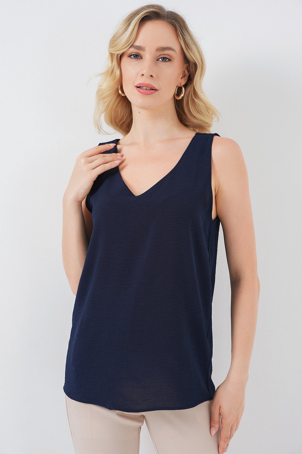 V Yaka Sıfır Kol Bluz 950 - Lacivert