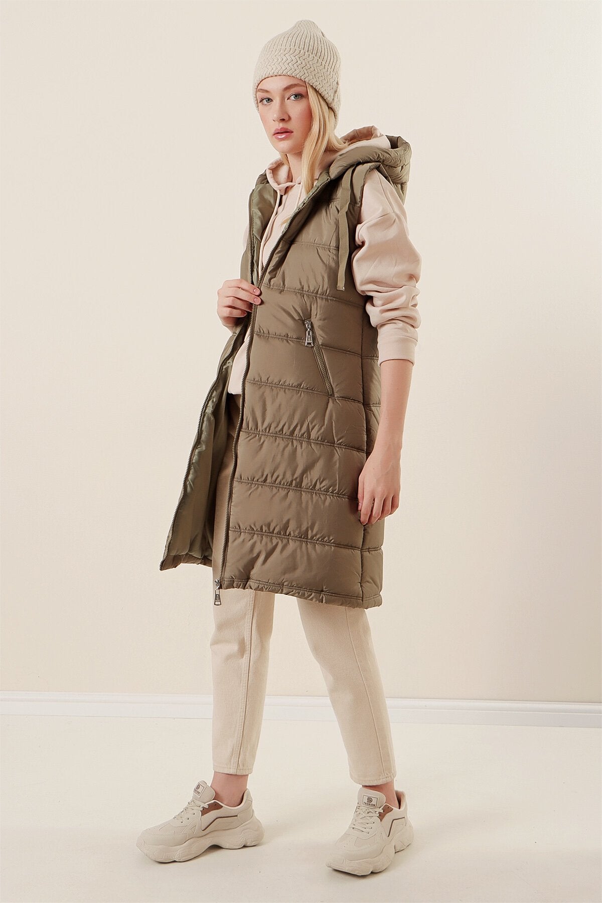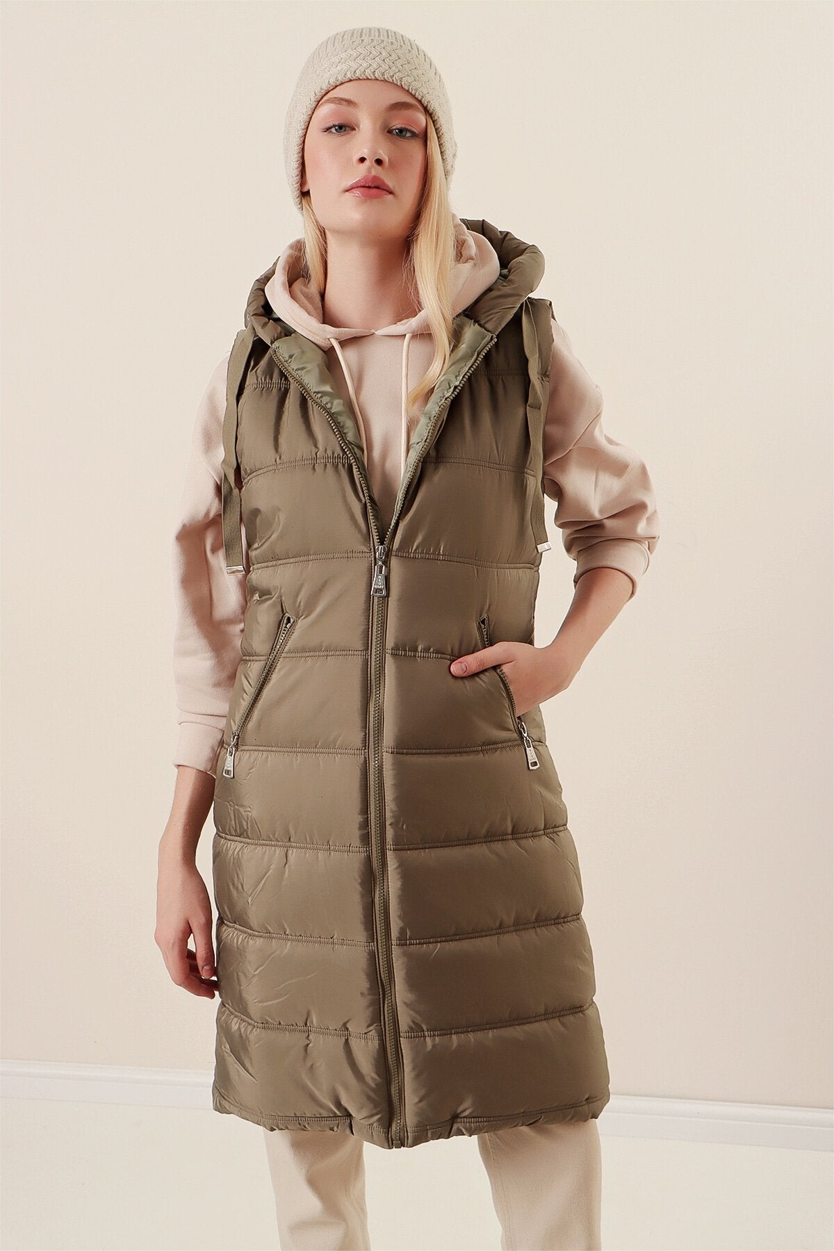 Kapşonlu Uzun Şişme Yelek - Çağla 5140