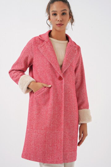 Merterium 9145 Kadın Kolları Tüylü Balık Sırtı Kaşe Kaban - Kırmızı