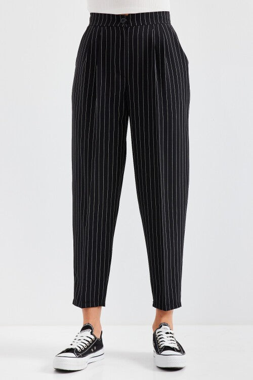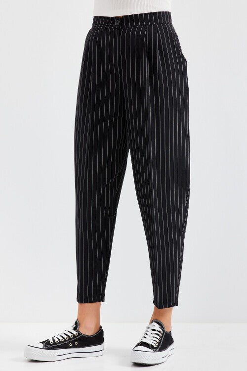 Yuqori bel shirinli matoli shim – Qora (6637 baland bel chiziqli matodan shim - qora)