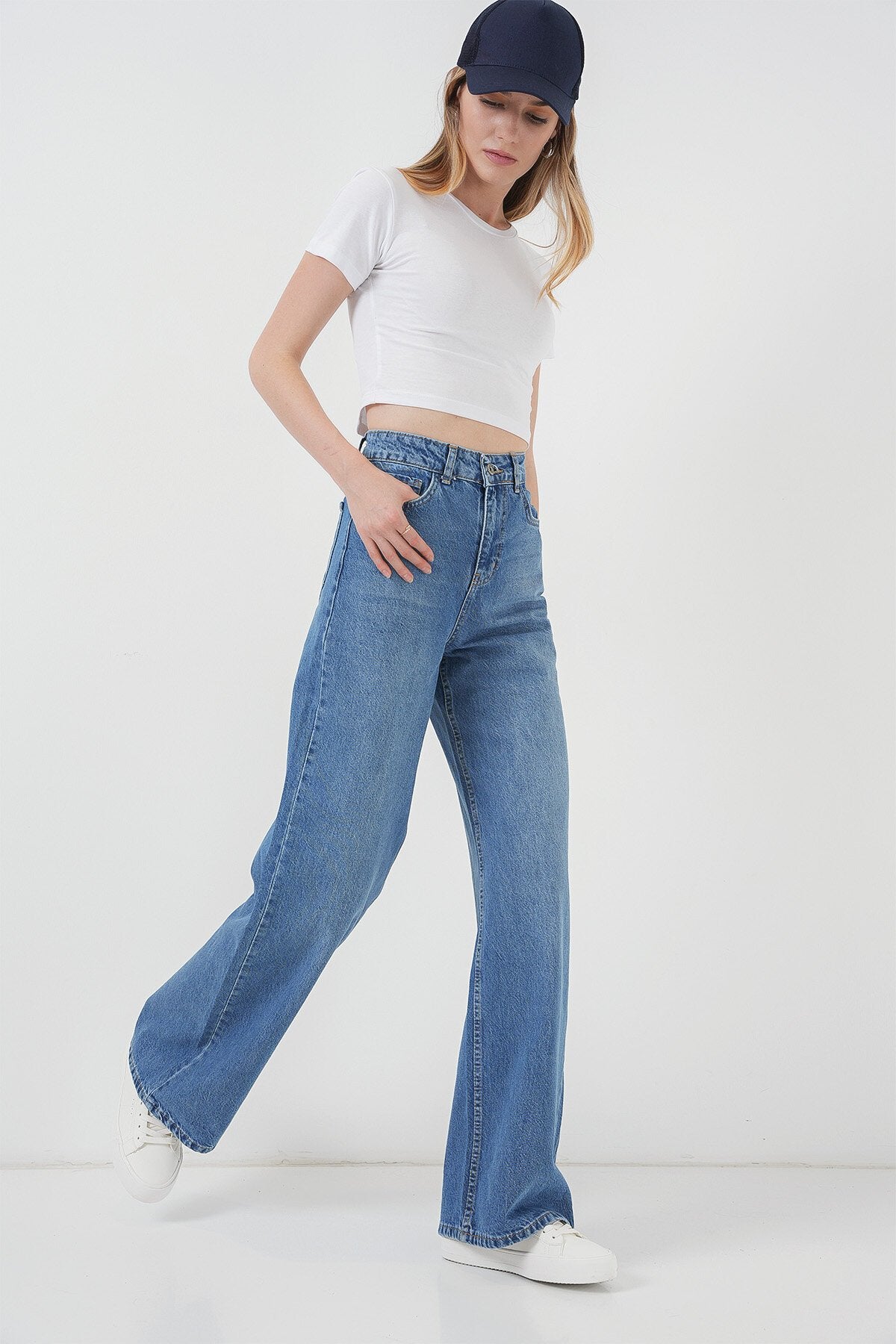 Аёллар учун кенг балақли юқори белли палаззо джинси шим – Тўқ кўк