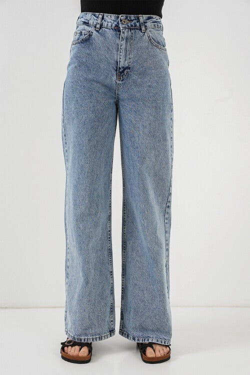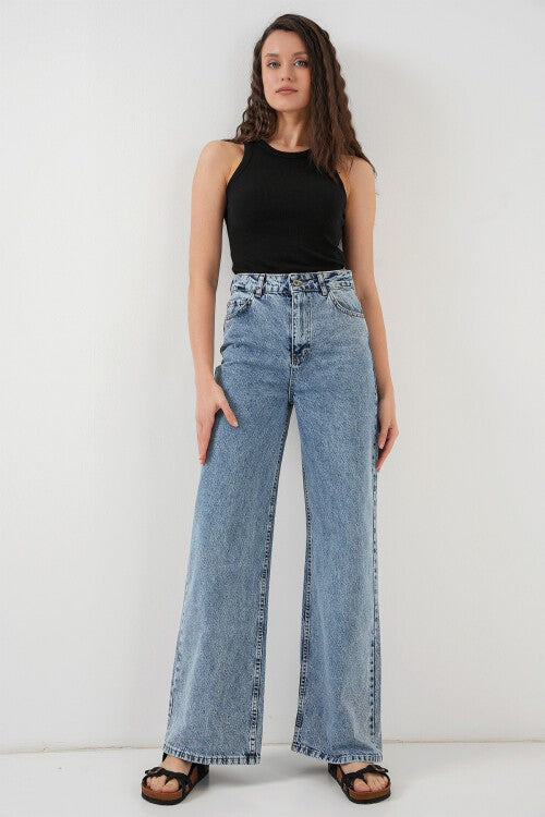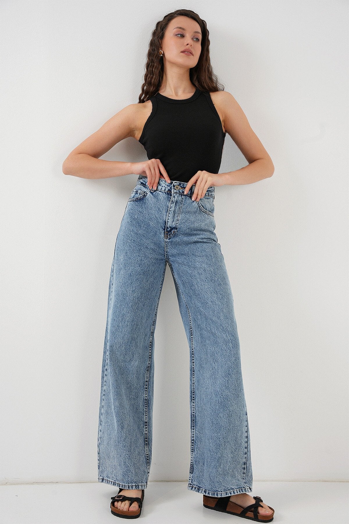 Ayollar uchun keng oyoqli baland bel palazzo jinsi 6656 - Moviy