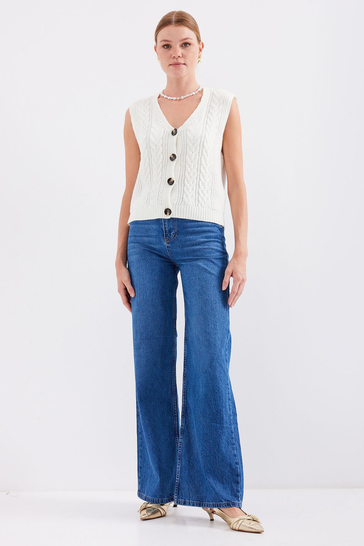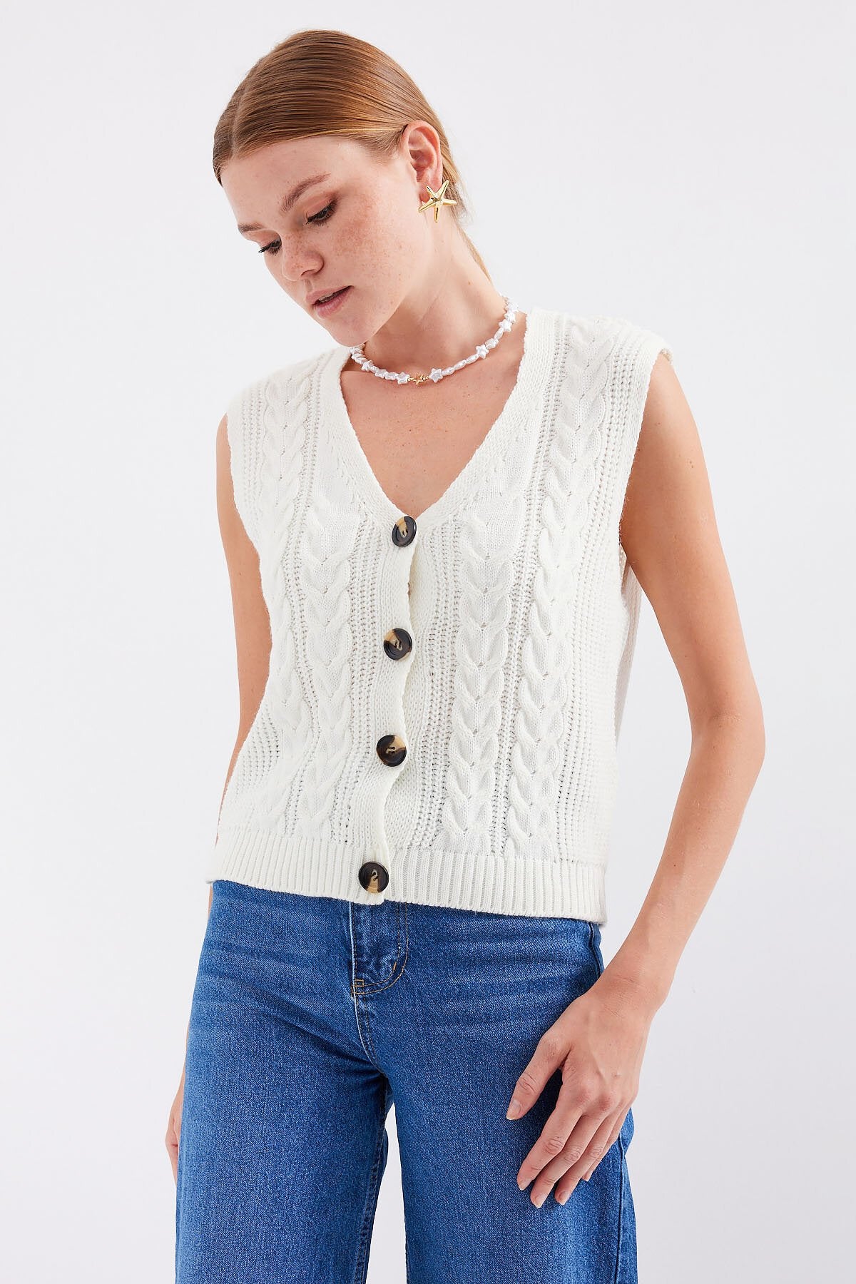 Tugmali kalta trikotaj yelek - oq 15882