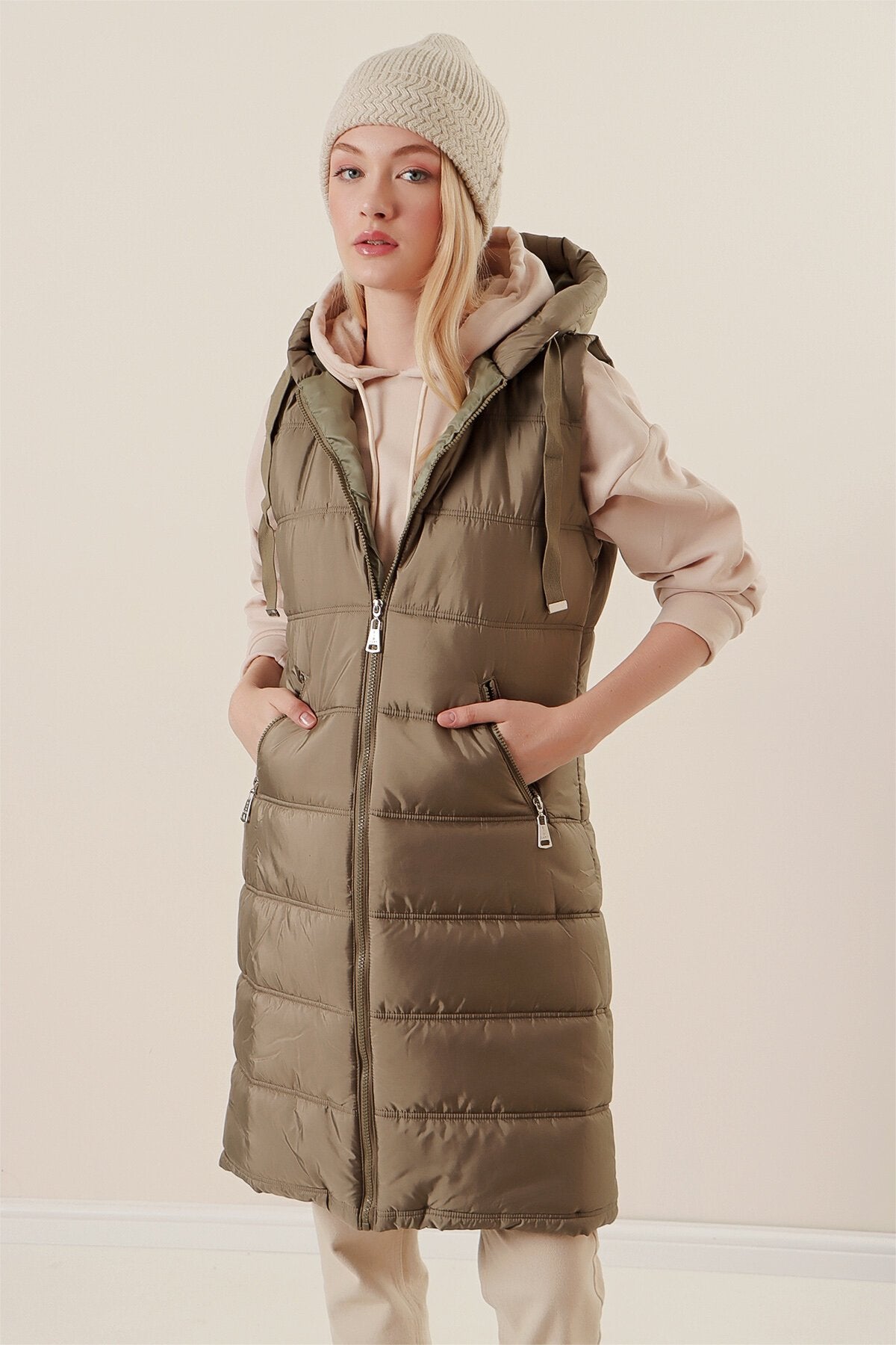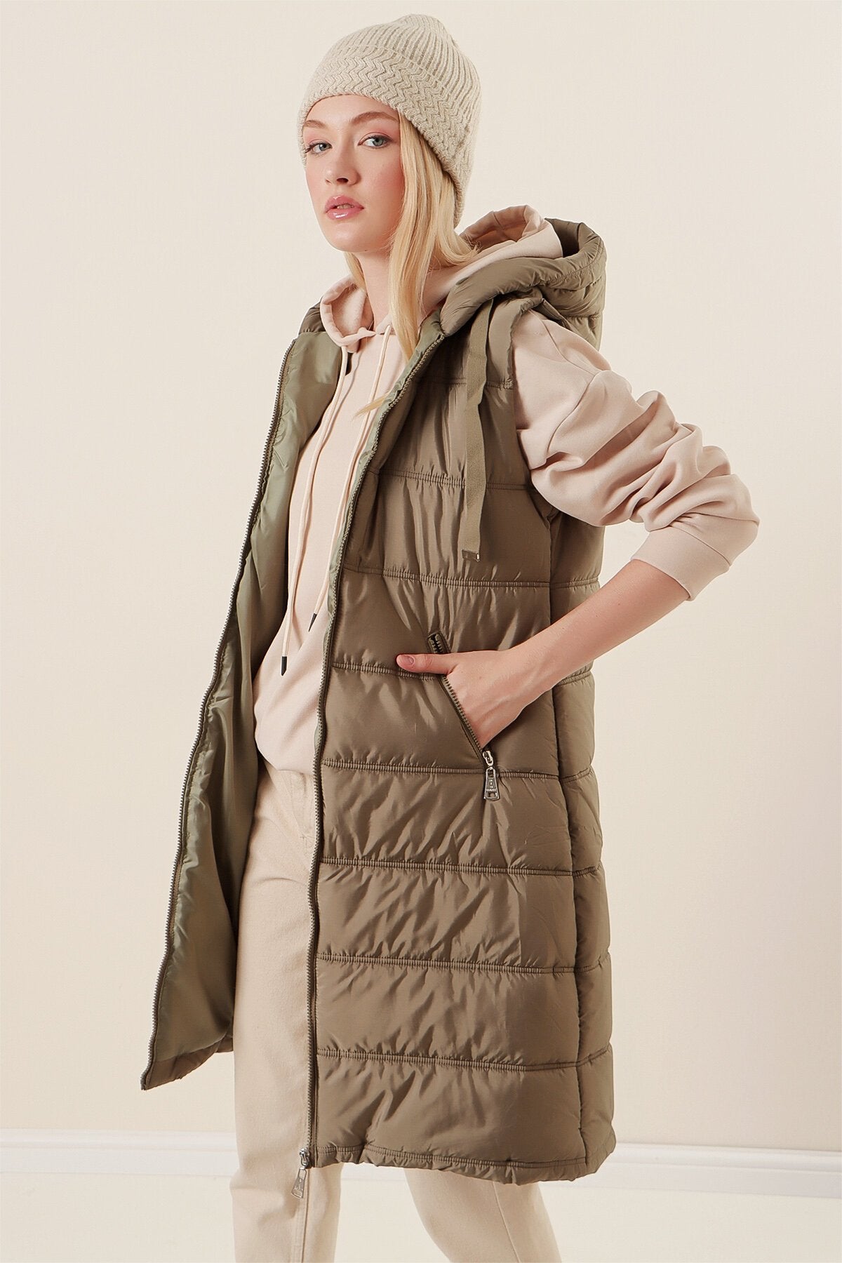 Qopqoqli uzun puffer yelek - Çağla 5140