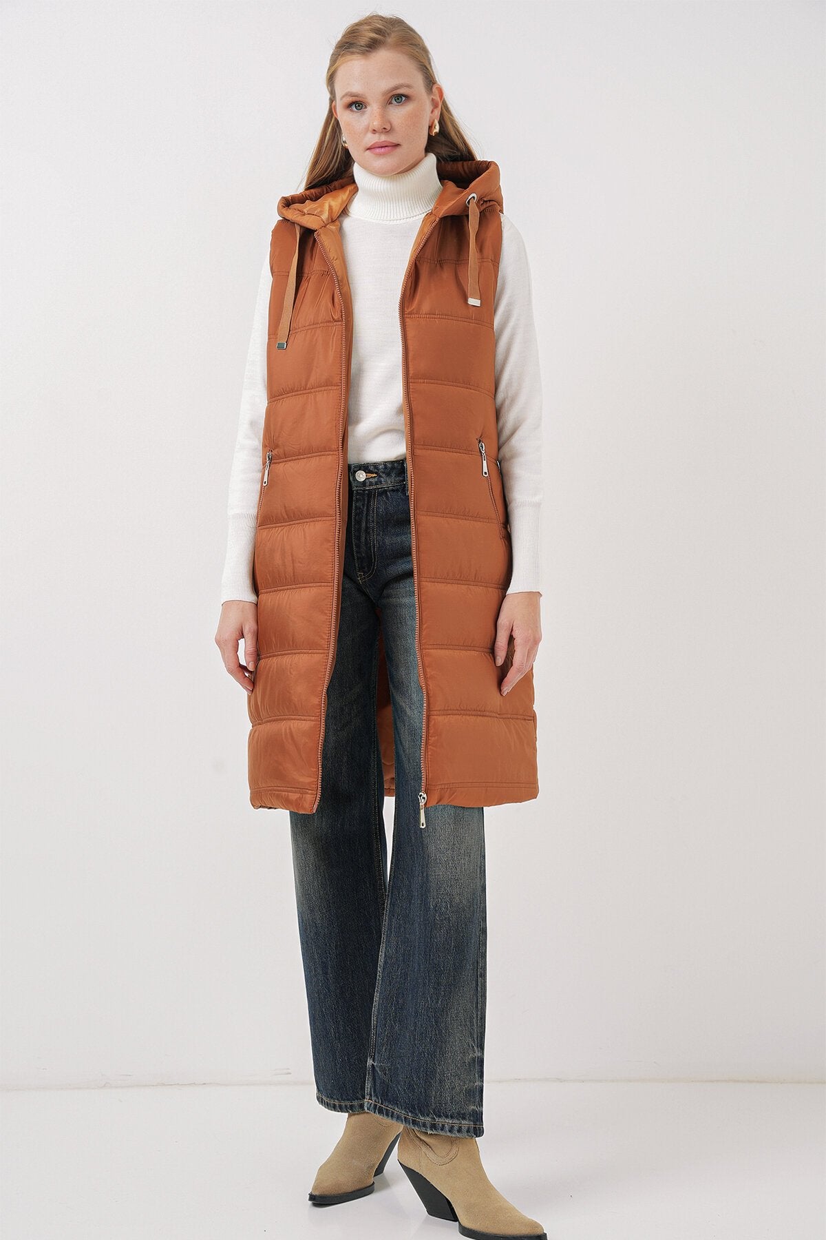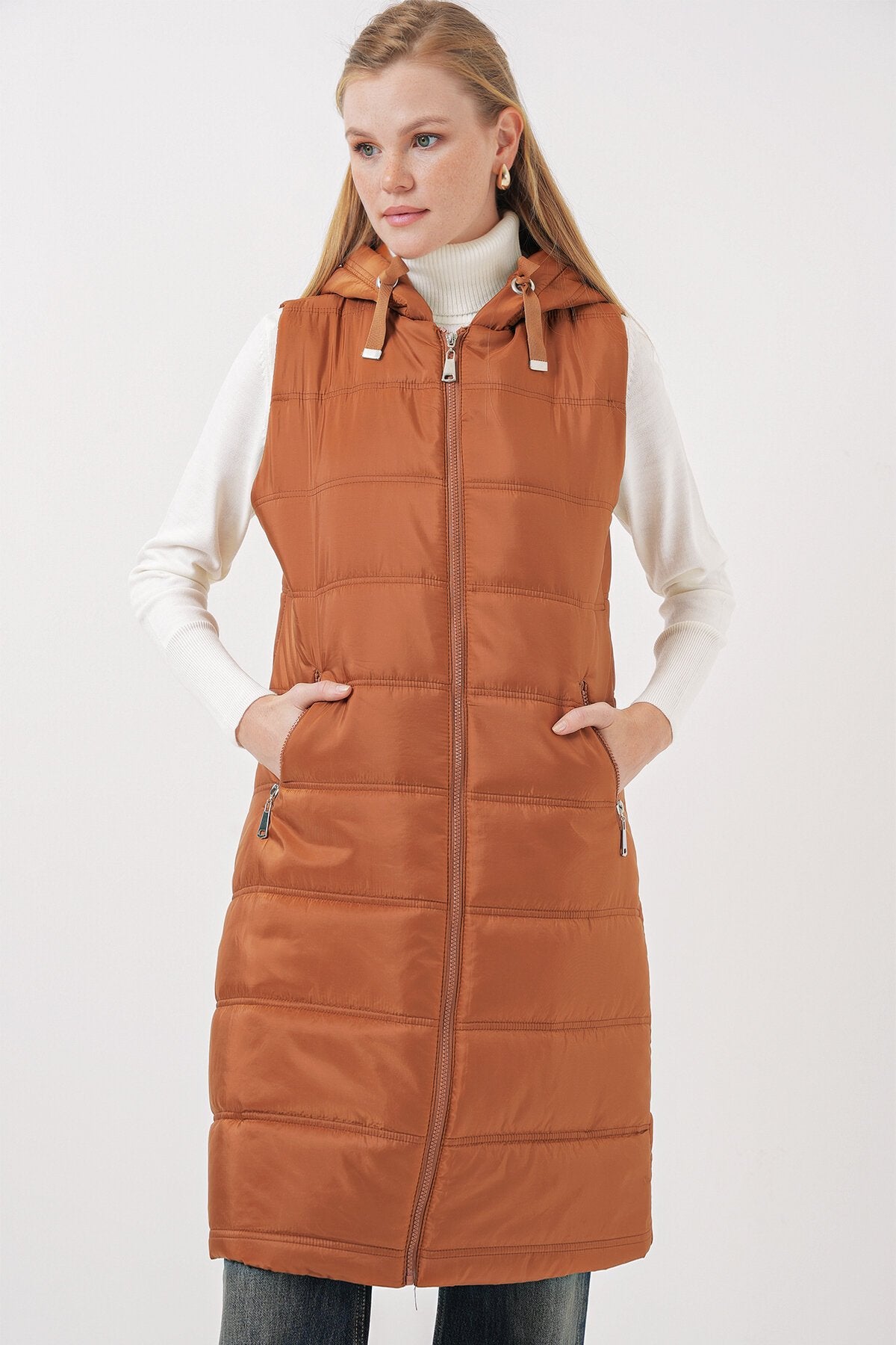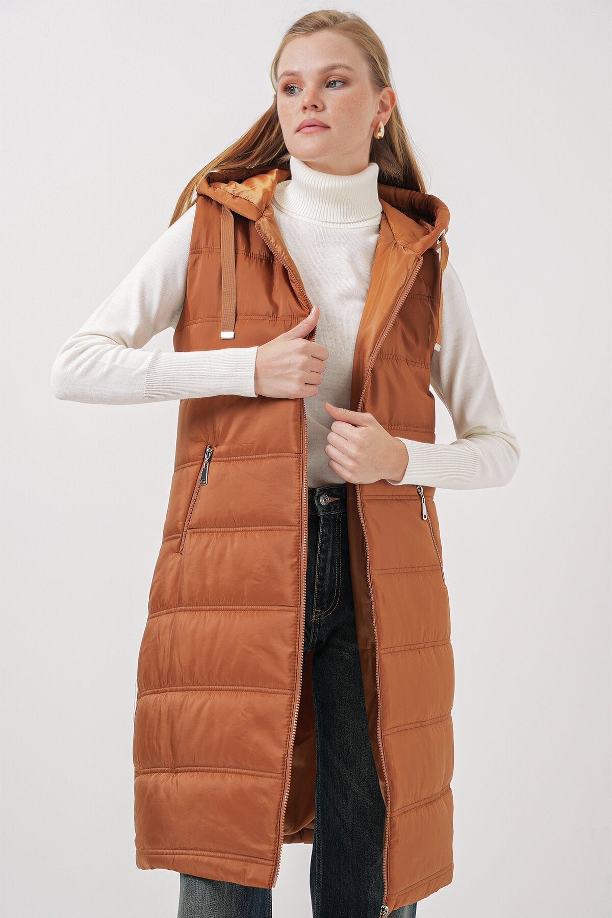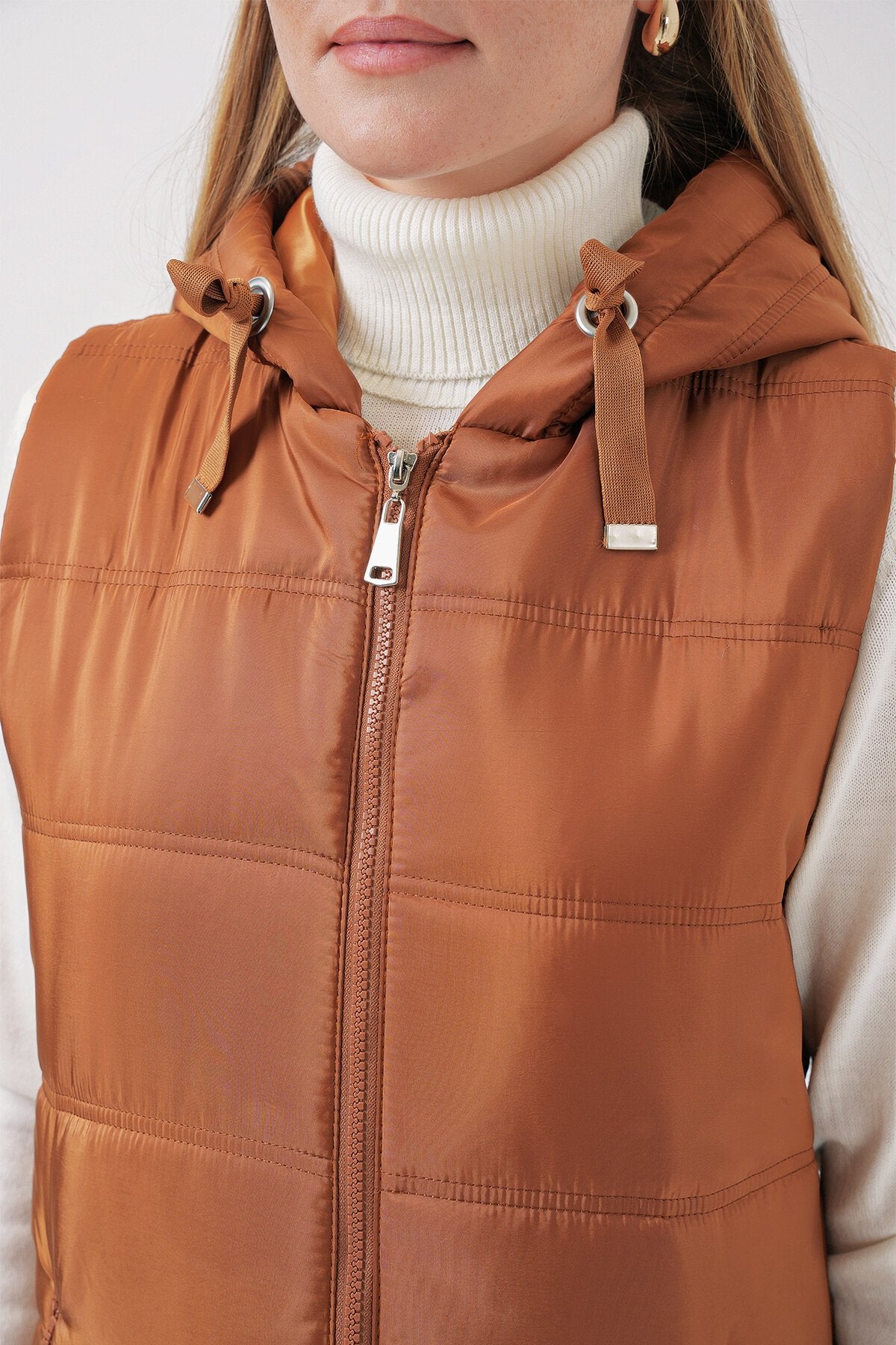 Qopqoqli uzun puffer jilet - Camel 5140