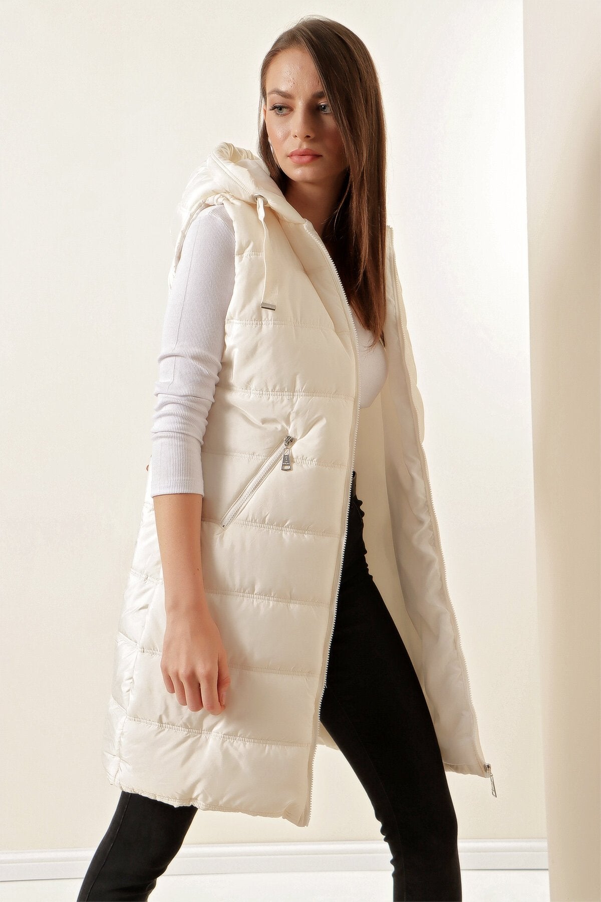 Qopqoqli uzun puffer yelek - Ekru 5140