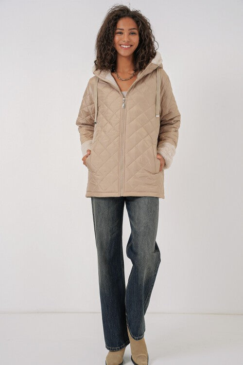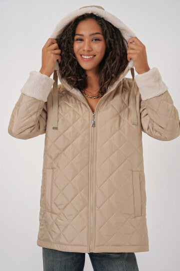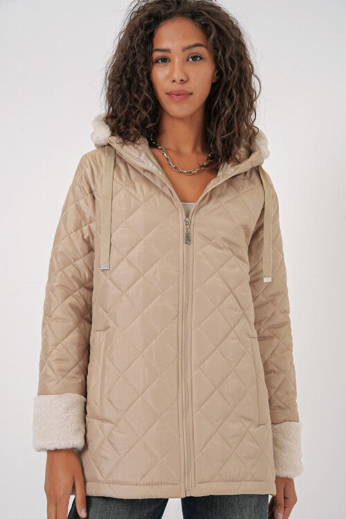 Mo'ynali kiyimlardan batafsil kaputli ko'rpali palto