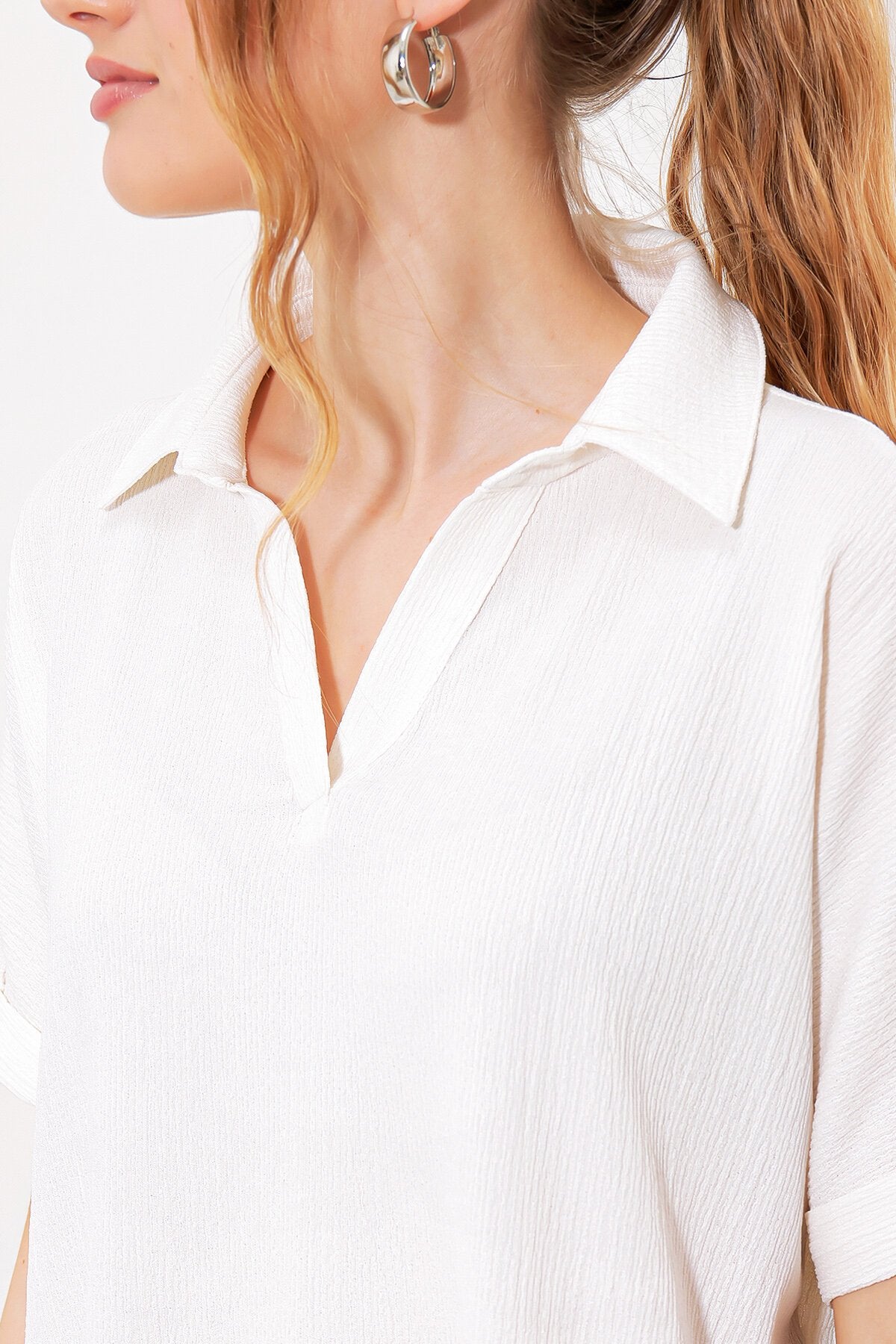 Аёллар Оқ Оверсайз Поло Йака Ўрма Блузка