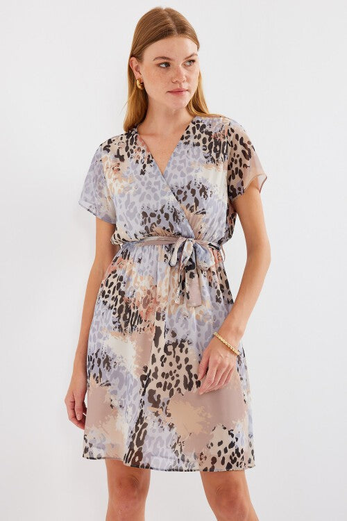 Қисқа енгли нақшли шифон кўйлак – Кулранг 2502