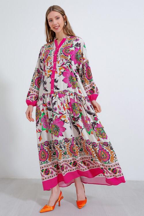 Ayollar Fushiya-Krem Naqshli Viskoza Hoijobli Qo'ylak (2423 Ayollar uchun fuşya krem naqshli viskoza hijobli libos)