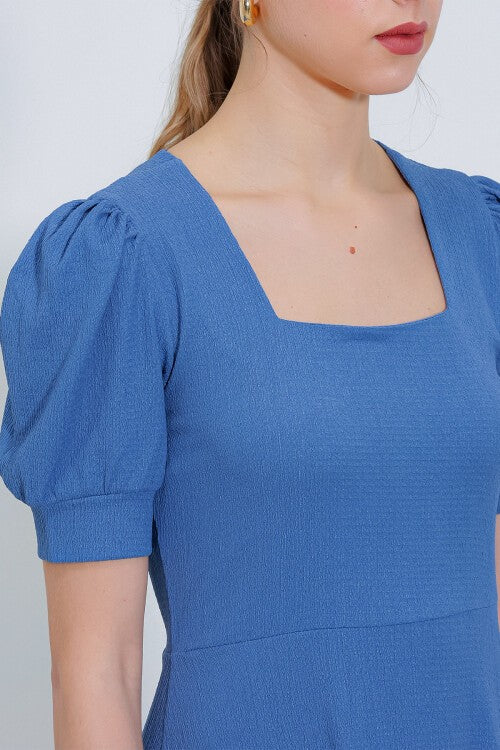 Аёллар учун индиго тўртбурчак-йака трикотаж мини кўйлак